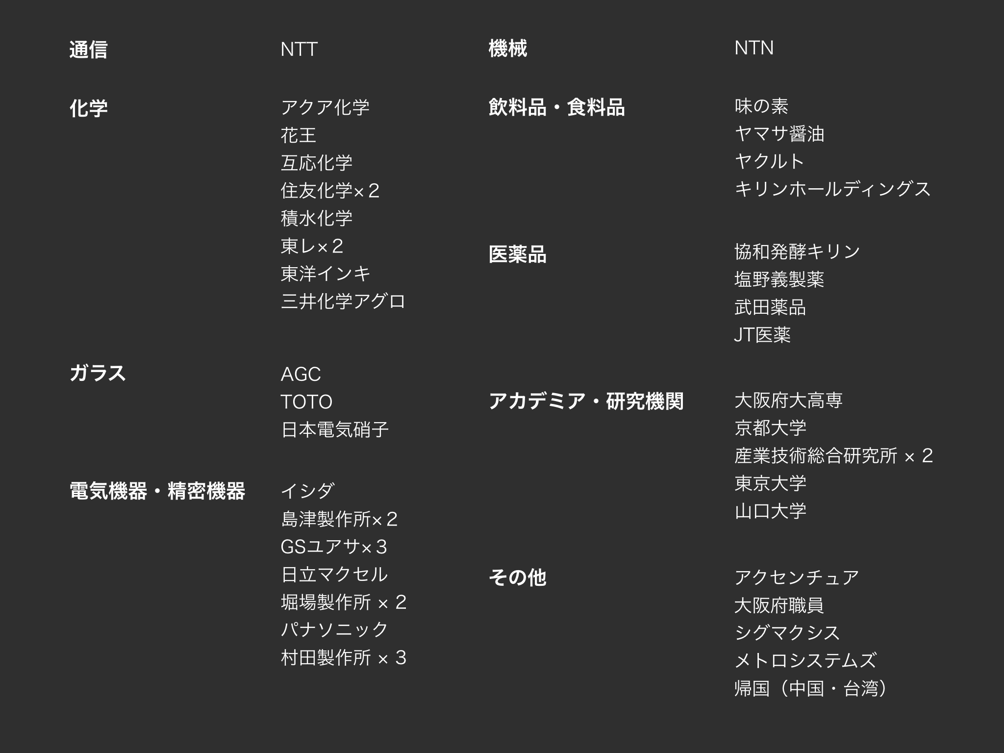 化学、食品メーカーや製薬企業、機器メーカー、コンサルなどの幅広い企業に優秀な人材を輩出しています。また、アカデミアや研究機関、公的機関へのステップアップも豊富な実績があります。