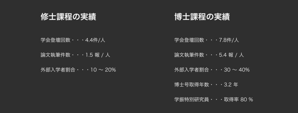 さらに、博士課程に進学している学生も、内部生/外部性を問わず多くいます。本人の努力ももちろんありますが、このような研究環境において、ほとんどの方が3年間で豊富な実績を積み上げ、博士号を取得しています。また、経済面や研究者としての最初のキャリアサポートとしても、学振特別研究員への採択を全力で支援しています。実績として80%の取得率を達成しており、産官学の様々な分野に卓越した博士号取得人材を輩出しています。